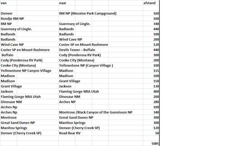 Hallo Forum leden, zo ziet onze eerste opzet er uit. Zijn er suggesties ? Over waar en hoe lang we ergens moeten blijven. We gaan met een camper. En is dit te doen in deze periode? We zijn ruim op tijd. Route USA- en/of Canadareis Datum Plaats Dagafstand (km) 01-06-2013 Denver 0 02-06-2013 Rocky Mou...