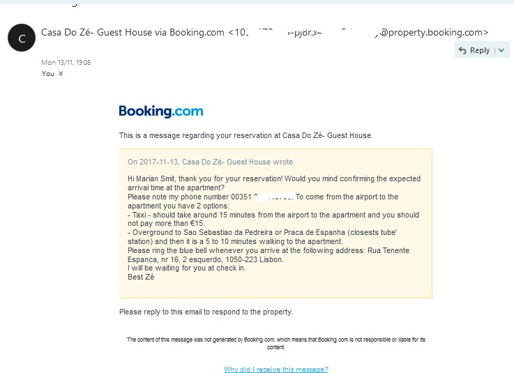 Ik krijg regelmatig berichten van hoteliers na het boeken, zo bijzonder is dat toch niet? Of ze nog excursies moeten regelen, dat ze een wellnesscenter hebben en of je nog wat wilt reserveren of over de aankomsttijd. Ik neem ze altijd voor kennisgeving aan en doe er verder niets mee. Maar daar blijkt inderdaad uit dat boekingen wel gelijk worden doorgestuurd.