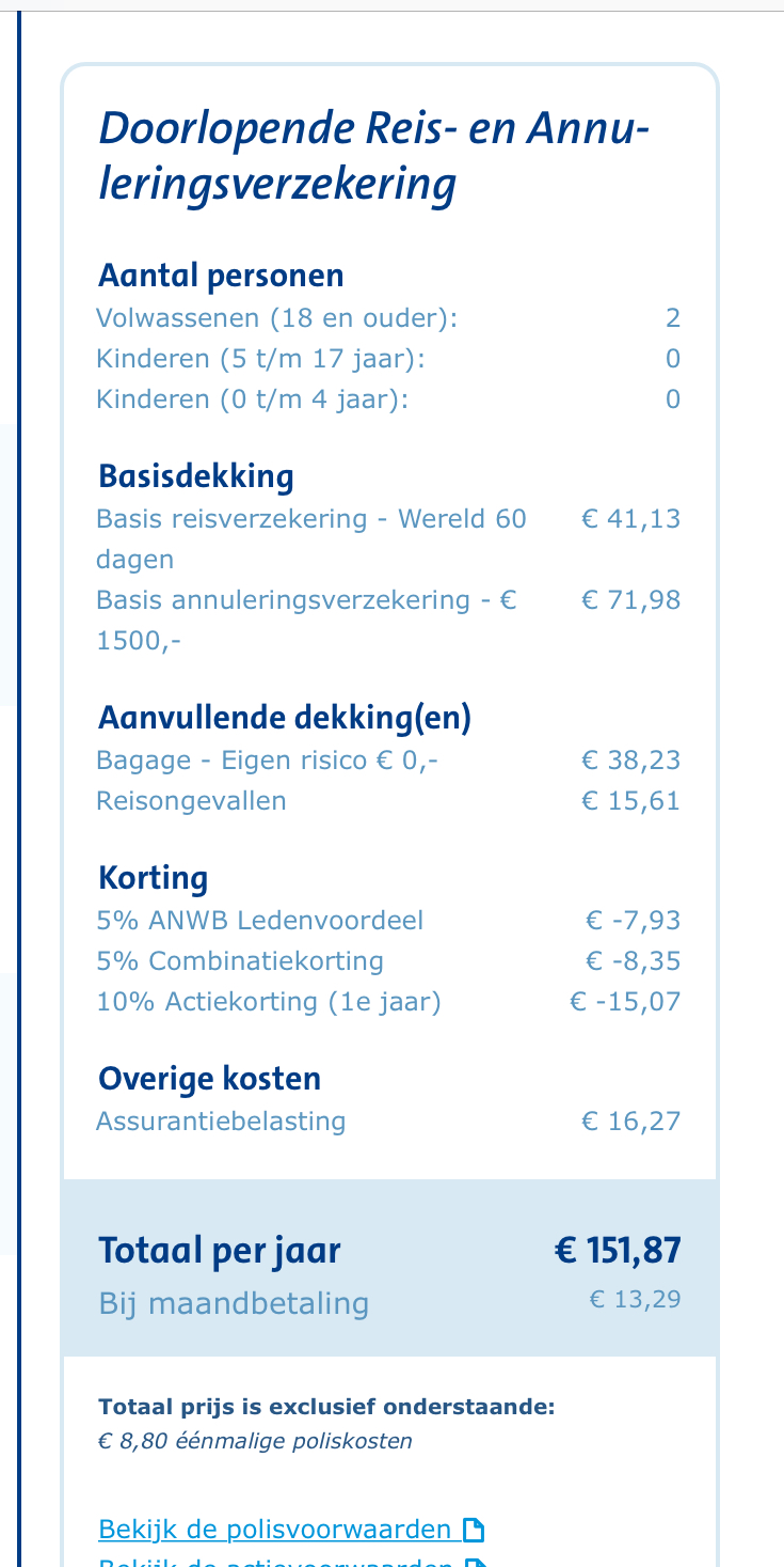 Even reken voorbeeldje voor doorlopende reis en annuleringsverzekering bij ANWB (met slechtere voorwaarden dan AMEX).