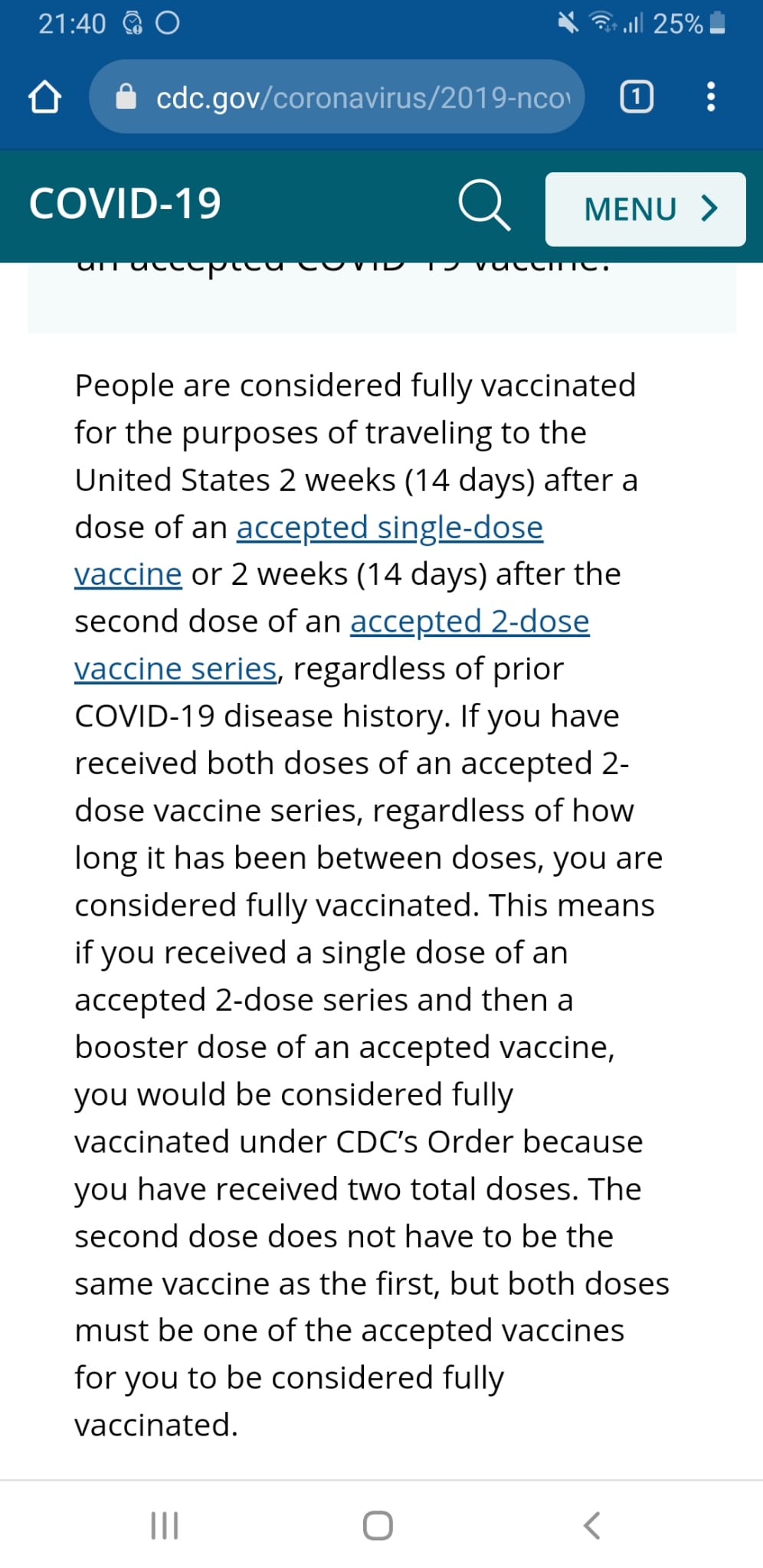 At this time, CDC’s Order only requires that noncitizen nonimmigrants are fully vaccinated with the primary series of an accepted COVID-19 vaccine to board a flight to the United States. A booster dose is not needed to meet this requirement