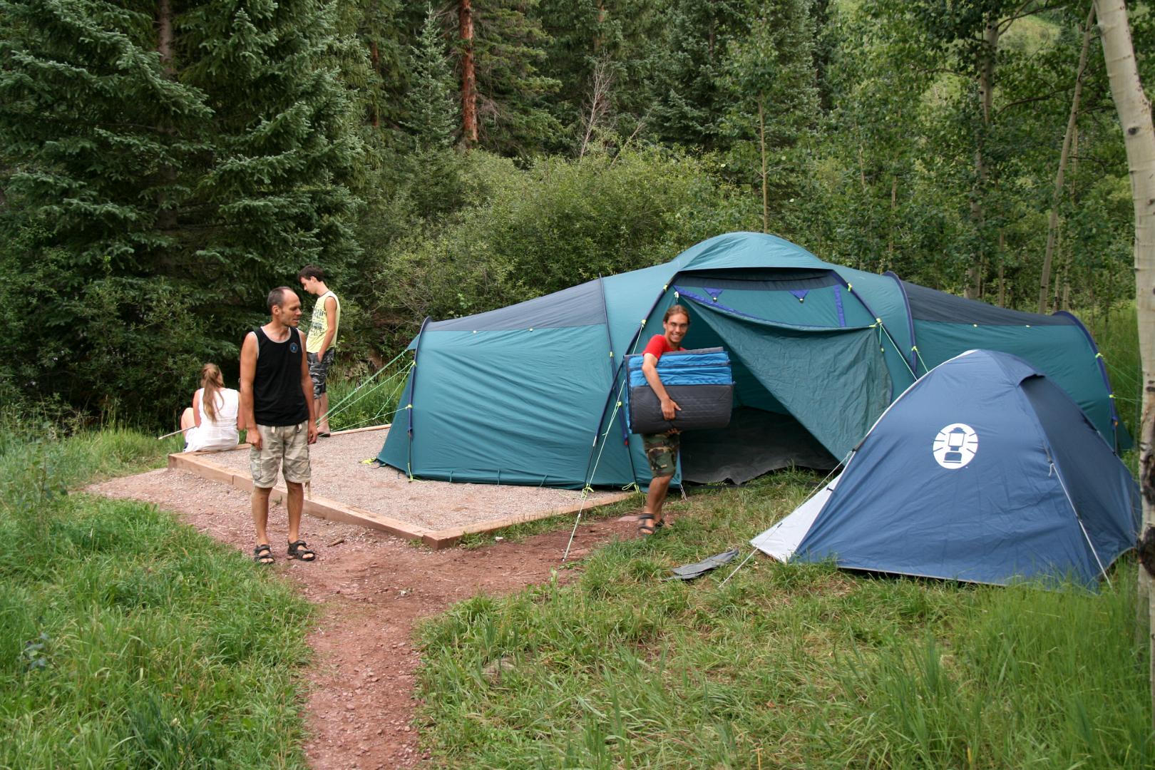 Wij dachten dat je alleen maar in de 'jeu de boules' bak tentjes mocht opzetten en niet daarbuiten (we waren nogal geïntimideerd door de mannen en vrouwen met 'big hats' die meestal ontzettend aardig maar soms ook behoorlijk autoritair bleken te zijn) :wink: . Zie hier hoe we onze 3 tentjes binnen de balken hebben opgezet in Moraine Park Campground in RM NP (we waren met 4p, maar de twee pubers wilden perse een eigen tent ...) ... later zagen we amerikaanse buren tenten all over the place wegzetten.