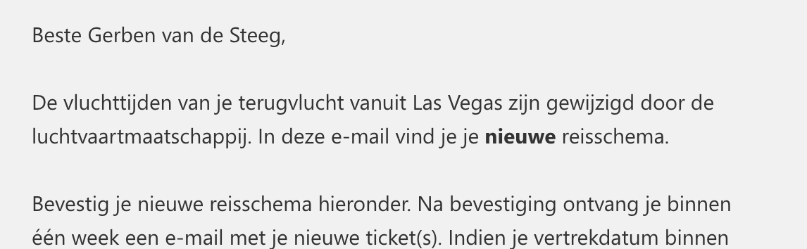 Het mooie is nog wel dat ze schrijven dat ze hopen dat ik happy ben met de nieuwe vlucht tijden. Welke dan, vraag ik me af, want er is me geen alternatief geboden voor de gecancelde vluchten, nog restitutie.