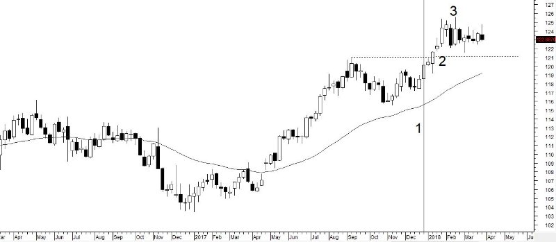 Inmiddels is de koers duidelijk boven 1.21 (lijn 2) gekomen en heeft bij 1.255 een nieuwe top (3) bereikt. Het patroon van hogere bodems en hogere toppen is in de weekgrafiek nog intact en het 40 weeks exponentieel voortschrijdend gemiddelde stijgt nog steeds. Dat betekent dat het voorkeursscenario er nog steeds eentje is van stijgende koersen in de komende maanden. De afstand naar het voortschrijdend gemiddelde maakt een pauze in die stijging voor de hand liggend.