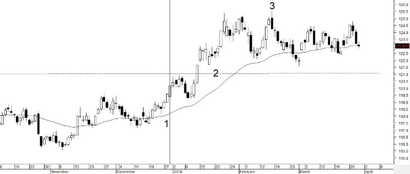 Op de daggrafiek is die pauze te zien. Na het doorbreken van lijn 2 en het bereiken van de top bij 3, is de koers zijwaarts gegaan. Een koers boven de laatste top (1.25) betekent een hervatting van de stijgende trend. Een koers lager dan 1.21 betekent een verzwakking, maar nog niet het einde, van de stijgende trend in de weekgrafiek.