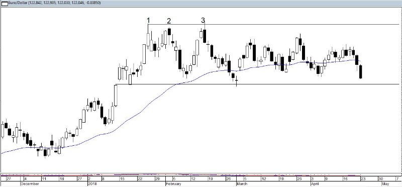 Die pauze is te zien op de daggrafiek hieronder. De top uit de weekgrafiek is in de daggrafiek te zien bij 1, 2 en 3. In drie pogingen slaagde de koers er niet in boven de bovenste horizontale lijn net boven 1.25 te komen en ontstond er een zijwaartse beweging rond het evg, dat zijwaarts verloopt. De onderste horizontale lijn net boven 1.21 is de ondergrens hiervan.