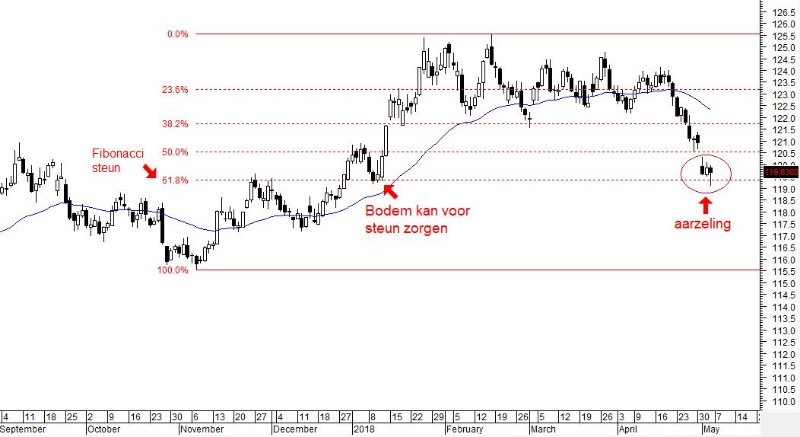 4) De koers bevindt zich op een Fibonacci steunniveau.