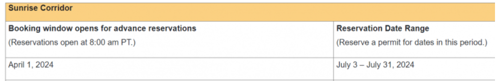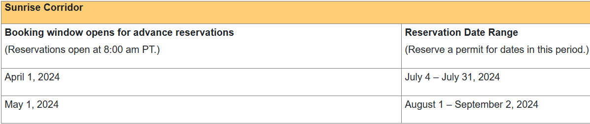 Timed entrance reservations are required from May 24-Sept 2, 2024, to enter the Paradise and Sunrise Corridors between 7:00 am-3:00 pm