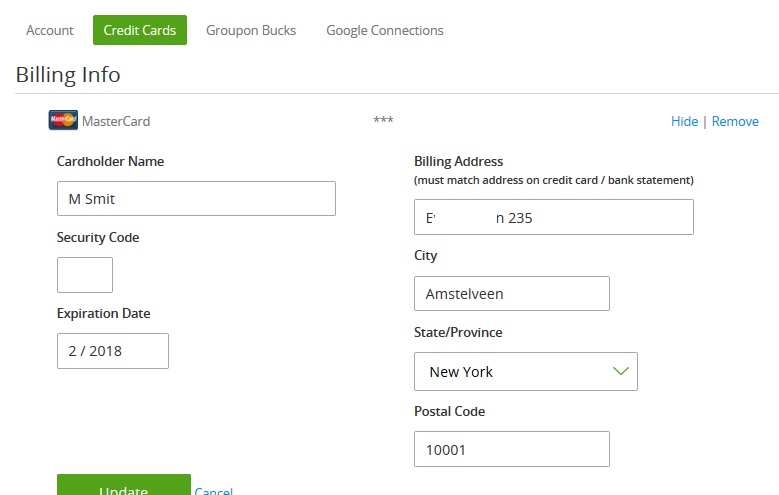 Ik heb mijn gegevens veranderd; dus met mijn Nederlandse straatnaam en Nederlandse plaats, New York en 10001