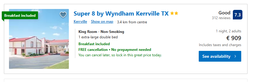 Vooral die tweede recensie is opmerkelijk. Maar ook gewone motels vragen absurde prijzen. Neem deze Super 8 in Kerville Texas