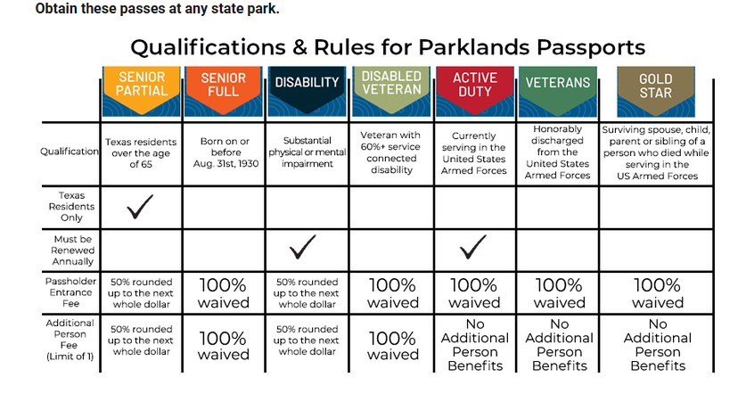 Mijn oog viel echter ook op het woordje 'senior' op de site. Wat blijkt, als je senior bent, dan kan je een "Senior Full" paspoort aanvragen. Daarmee kan je gratis alle staatsparken in! Geldt ook voor niet-Texanen! Eén klein detail, de leeftijdgrens om hiervoor in aanmerking te komen is vrij hoog. Je moet 93 jaar of ouder zijn.