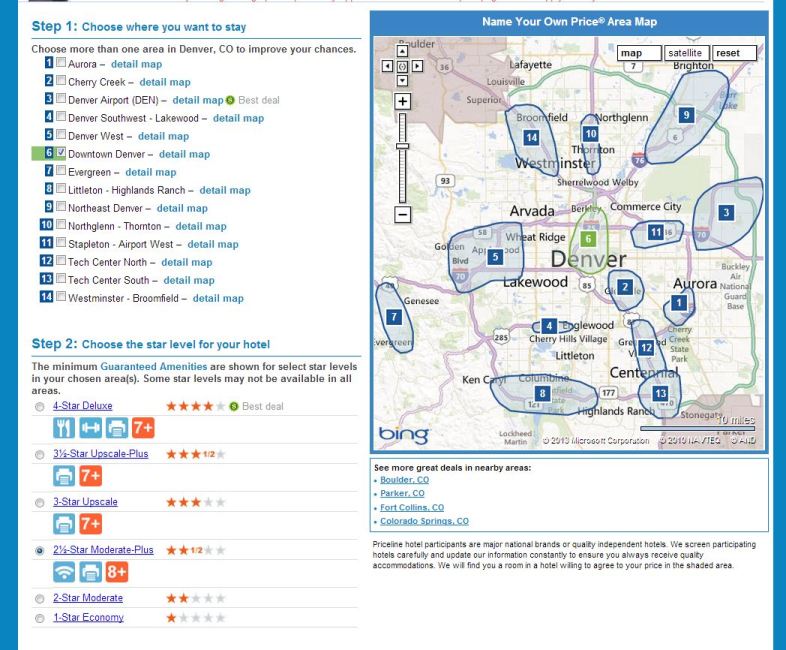 Als ik op de website van priceline wil bieden voor een hotel in Denver Downtown met een **1/2 sterren, zie ik dat de "guest review score 8 or higher" is.