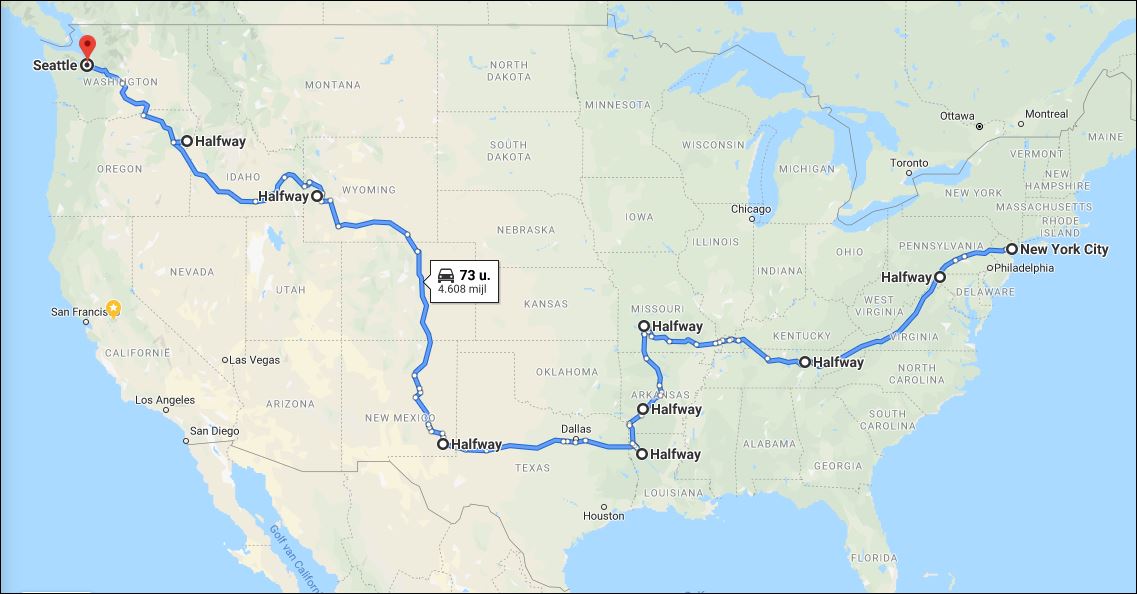 Het mooie van dit reisschema is dat je heel vaak halverwege bent. Op de kaart staan acht Halfway's aangegeven, maar er zijn er nog vier (in totaal er zijn twaalf plaatsen in Amerika die Halfway heten maar die ik kon vanwege de beperkingen van maximaal tien plaatsen in Google Maps niet allemaal aangeven.) Zie hier de hele lijst.