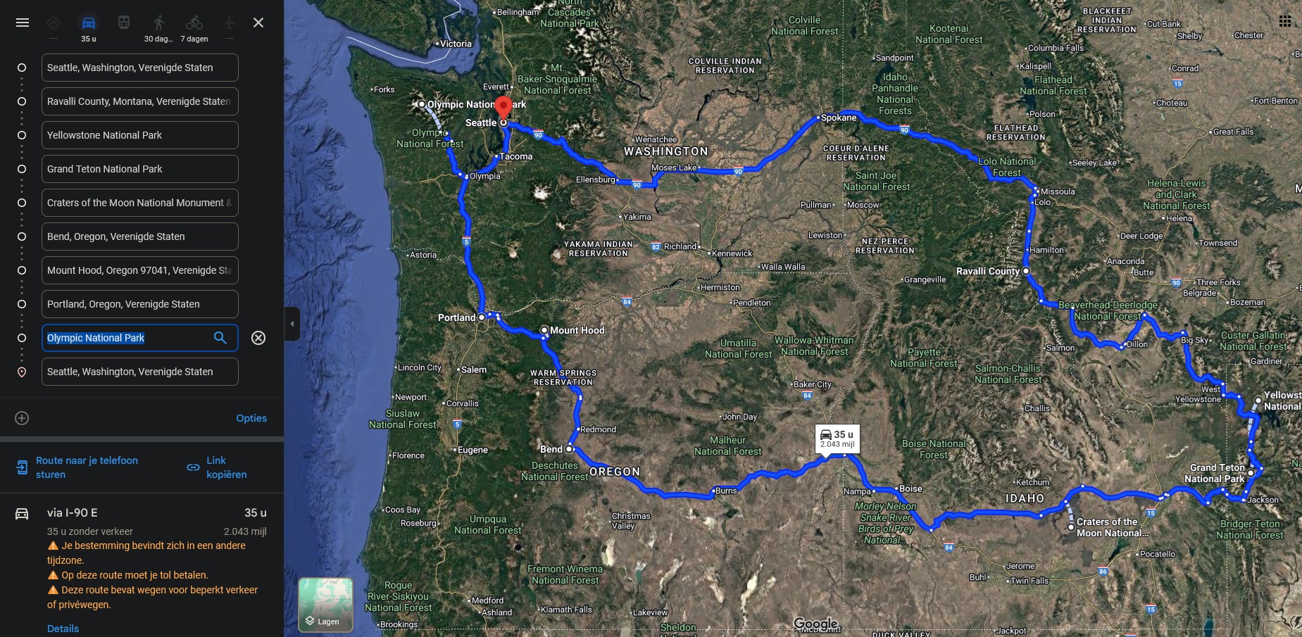 Als je zoiets hebt kun je gaan puzzelen en schuiven; misschien een nacht minder Yellowstone. Je ziet ook wat je mist; geen tijd voor de kust van Oregon en voor Olympic NP. Kijk naar de reistijden; mischien kan er ergens een tussenstop vervallen.