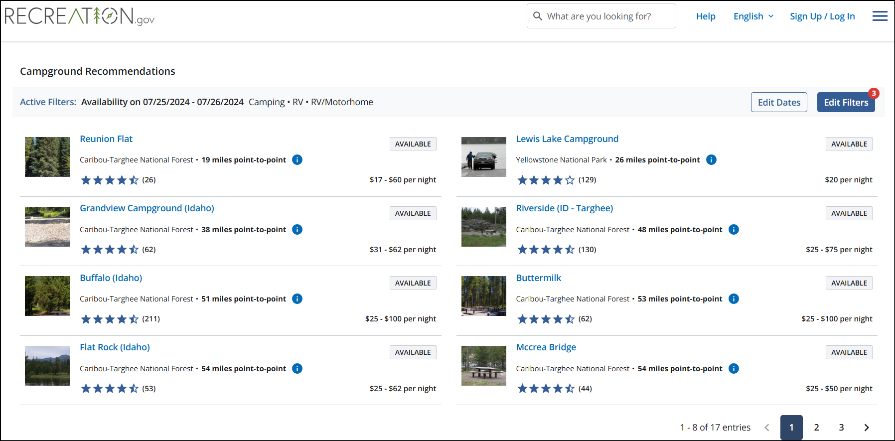 Je kunt de meeste campings in de parken vinden via www.recreation.gov, die is al eerder genoemd hier. Als je bijvoorbeeld voor Grand Teton iets zoekt vind je ook campings die in de omgeving liggen.
