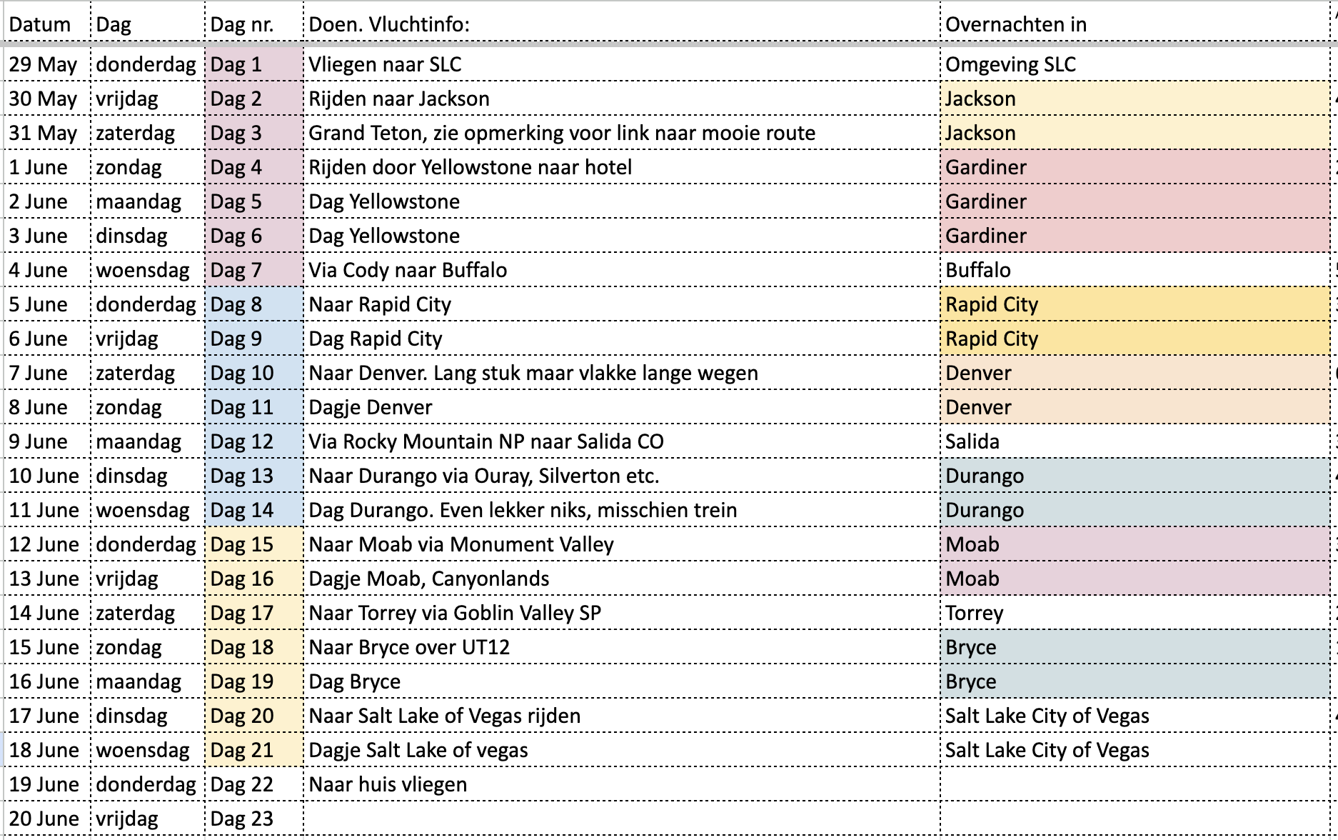 We landen op donderdag 29 mei in Salt Lake City en rijden de dag erna naar Jackson voor 2 nachten zodat we 1 volle dag voor Grand Teton hebben. Daarna gaan we naar Yellowstone voor 3 nachten. We hebben er dan bijna 3 volle dagen in YS.