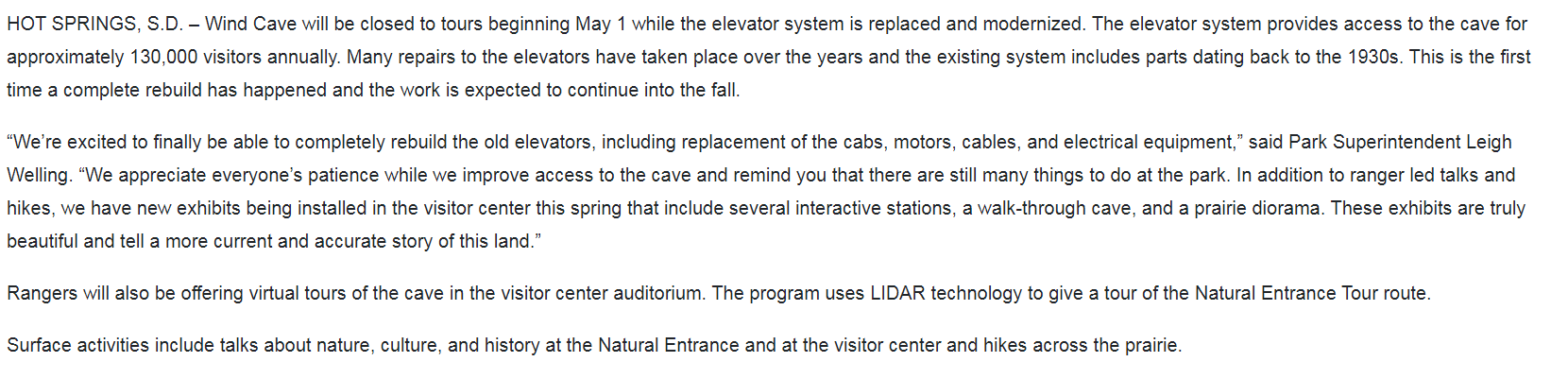 De grotten van Wind Cave zijn vanaf mei 2024 gesloten gedurende de hele zomer vanwege renovaties aan de lift.