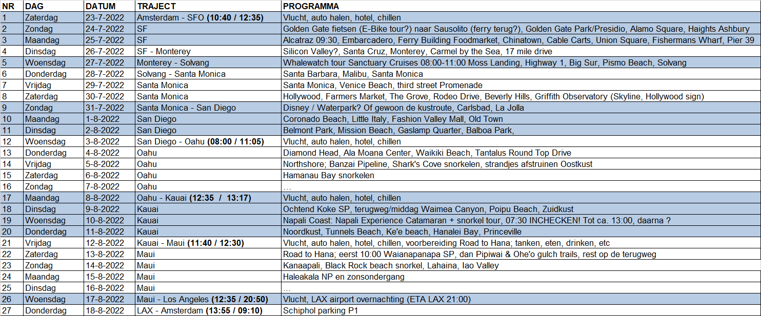 Planning ziet er nu als onderstaand uit, dagindeling beetje globaal en kan/zal nog wel wijzigen. Hotels zijn ook al gereserveerd, alles annuleerbaar uiteraard. Alleen op Maui zoeken we nog een mooie afsluiter maar daar zijn de prijzen toch wel echt heel stevig