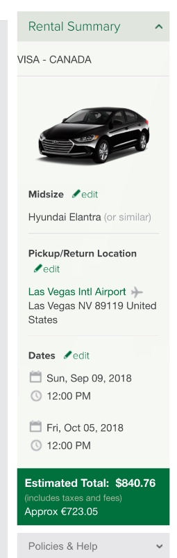 Via National EC executive met Visa Canada code 8572158 en coupon code NDA2324BR kom ik uit op $841 voor 9/9 - 5/10 in Las Vegas. Omgerekend is dat €723...scheelt nogal met Hertz.