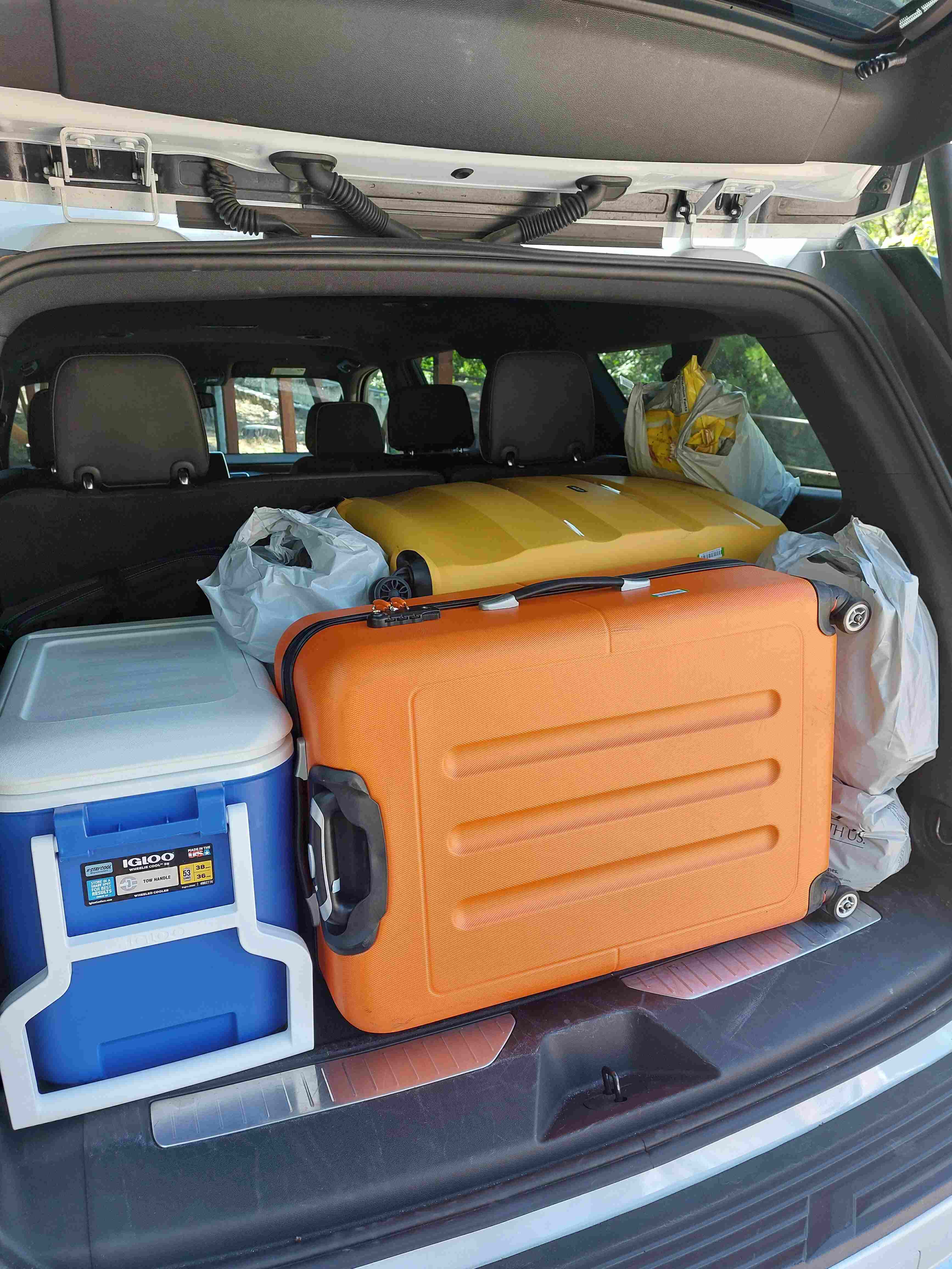 Ging ik nog een keer kocht ik een kleinere koelbox, gebleken is dat wij vnl drinken erin meenemen en geen versproducten. Wij denken dat zonder die grote krat, we alles (dus 3 northface L en 3 northface S duffels + wat losse tasjes etc) ook achterin de tahoe krijgen zonder een deel van de bank plat te klappen.