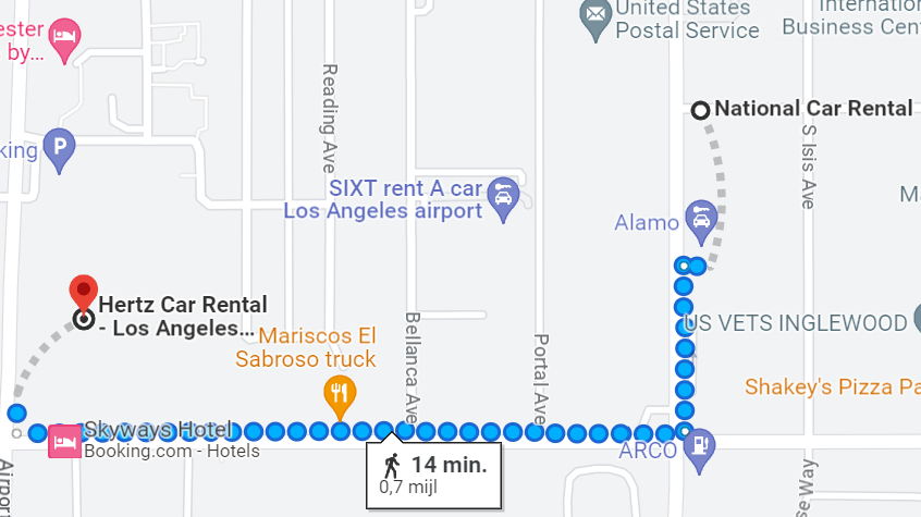 als je een boeking doet voor lax bij Hertz en National. Hoe doe je het dan om van de een naar de ander te komen mocht er niets staan wat je wilt ? Ze zitten niet echt vlak langs elkaar zoals op las vegas bijvoorbeeld