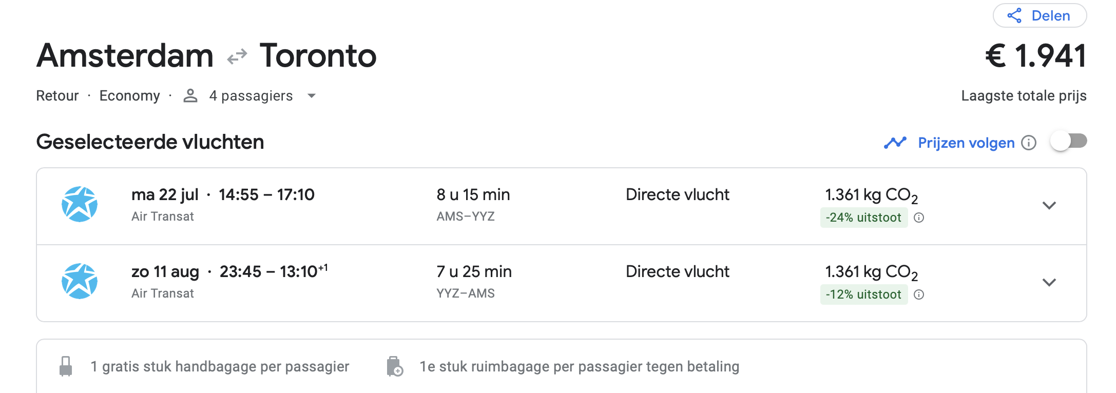 Mooie prijzen voor komende zomervakantie naar Canada. Rechtstreekse vlucht met Air Transat (oke in een Airbus a321 dus klein toestel, dat dan wel) voor 1941 euro met zn vieren. Dus nog geen 500 euro per persoon.