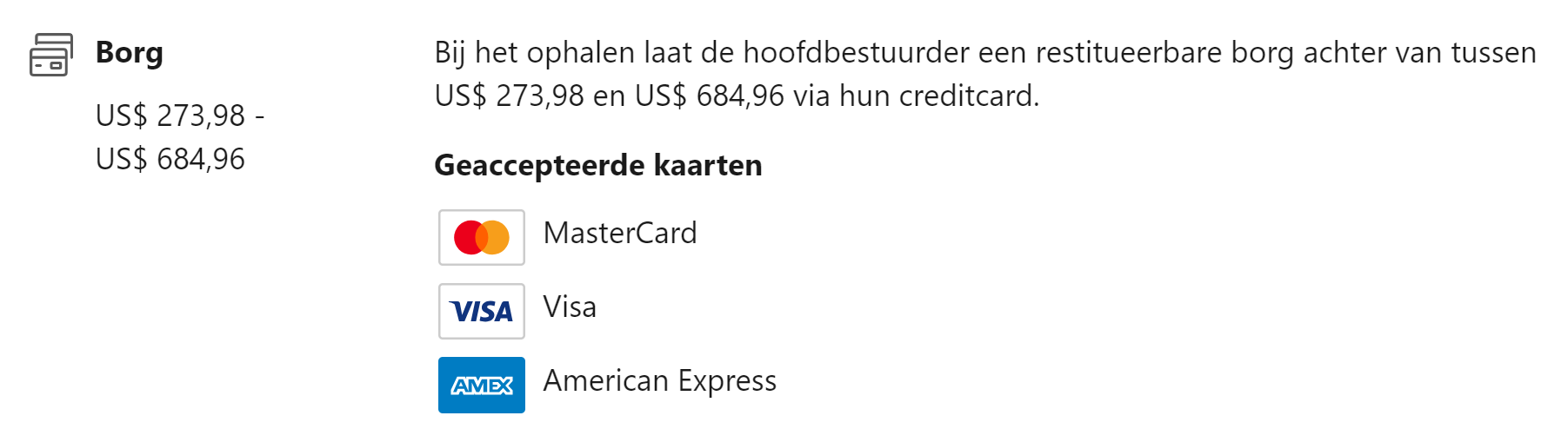 Doorgaans wordt er een borg op je cc gezet, maar niet daadwerkelijk afgeboekt.