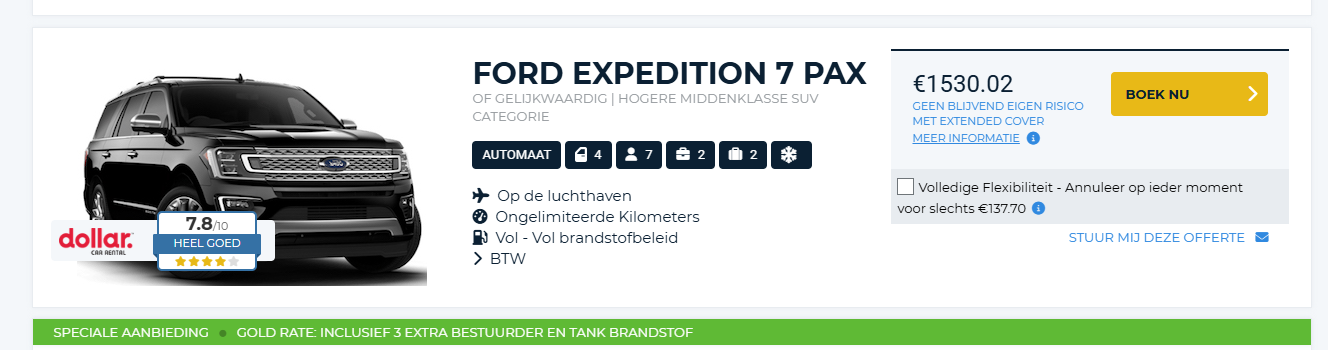 Via autoeurope Ford Expedition voor €1530. Incl 3 bestuurders en gratis tank.