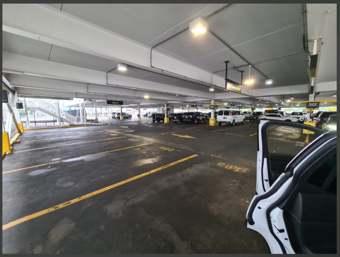 Ik loop die mensen voorbij en de garage binnen, de Hertz medewerker vraagt of ik een reserved auto heb. Ik zeg dat PC ben en ik zie 2 auto's staan in de PC aisle. De medewerker zegt OK en ik claim 1 van de 2 wagens, een GMC Acadia met 37.000 miles op de teller.