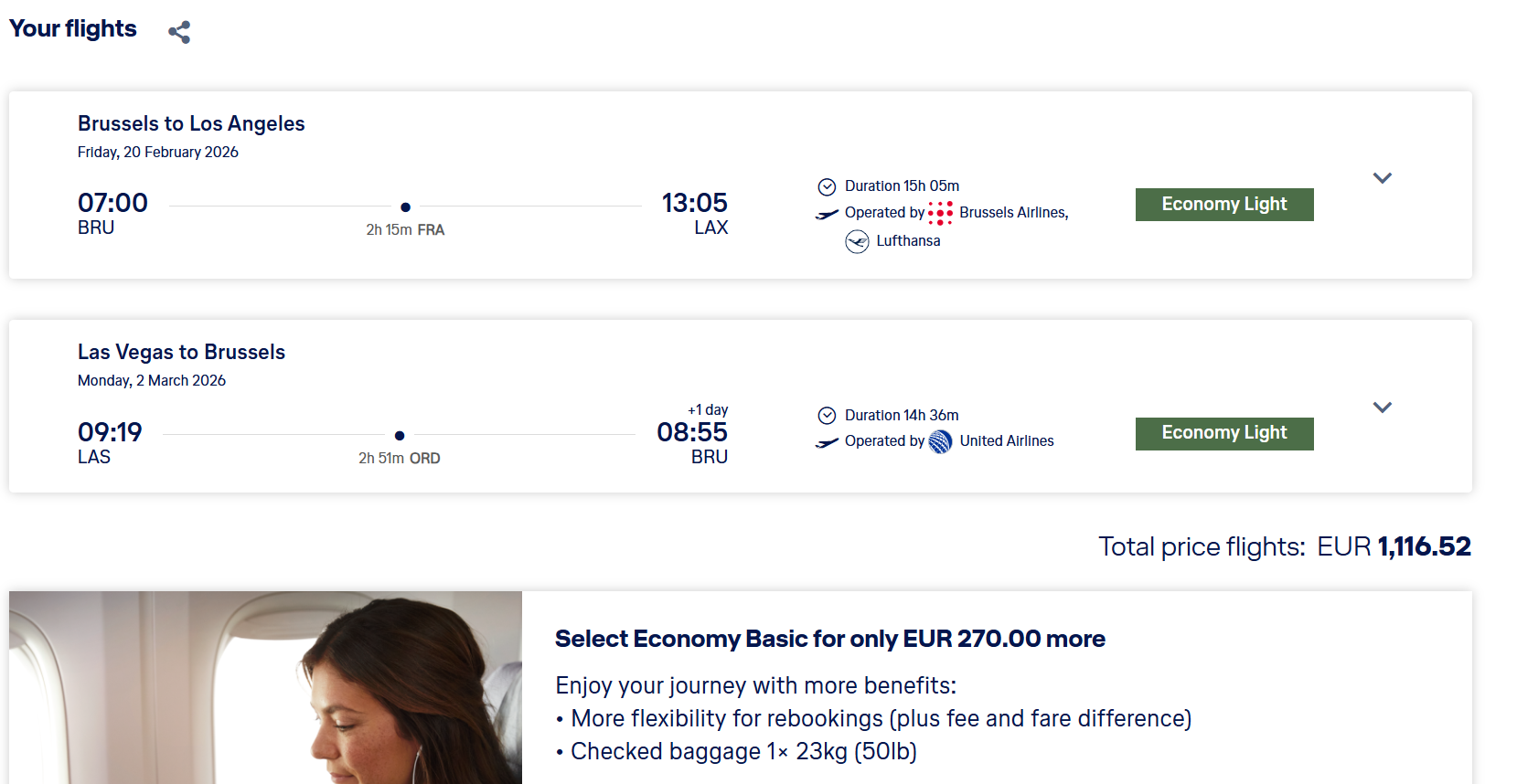 Ik ben aan het kijken naar tickets van Nederland/Duitsland/Belgie naar Los Angeles en vanaf Las vegas weer terug. Ik ga met mijn zoon dus 2 kleine koffers en 1 grote koffer is voor ons eigenlijk wel genoeg. Economy light zou in dit voorbeeld dus wel kunnen en dat ik later 1 koffer incheck ipv 2. Ik kan alleen niet zo goed vinden of ik dan goedkoper uit ben of dat ik beter naar basic kan boeken?