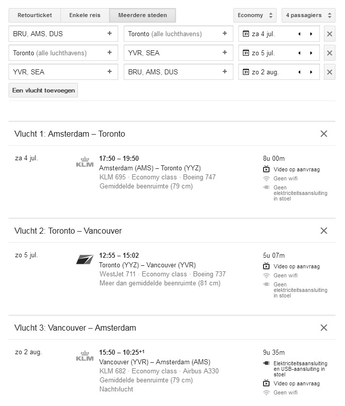 Voor lage prijzen moet je iets over hebben, zoals langere reistijd en 2x overstappen bijvoorbeeld en vertrekken op woensdag.bello schreef:Wie stuitte onlangs op een magische hoogseizoensale, of weet waar ik het beste kan beginnen met zoeken? We (2 vw, 1 kind, 1 baby) hebben onverwacht het aanbod gekregen om een maand in het huis van kennissen in Vancouver te verblijven. We wilden eigenlijk voorlopig niet meer richting Noord-Amerika, maar deze stad staat al zo lang op ons lijstje!