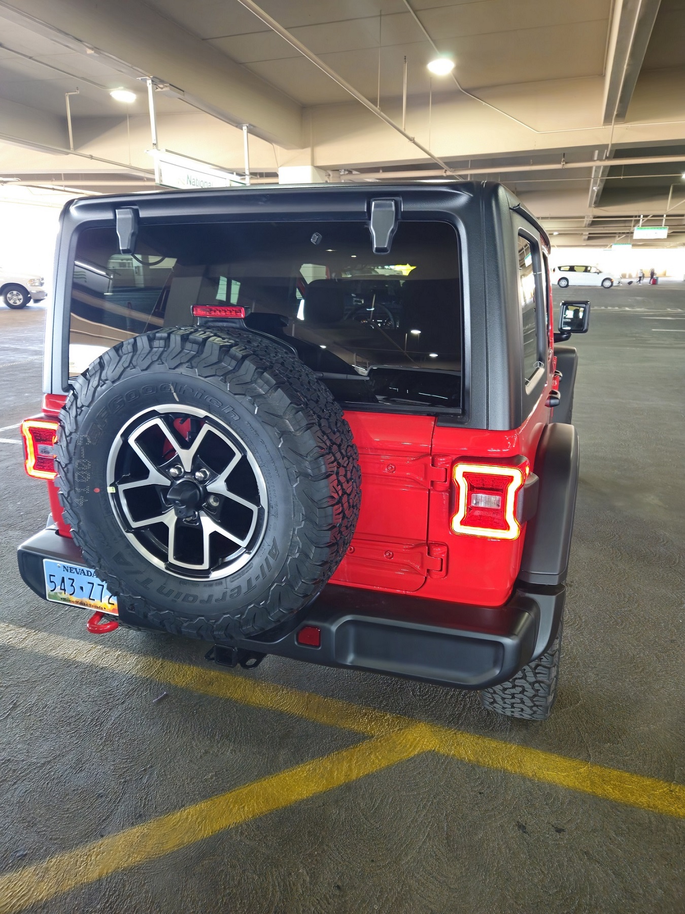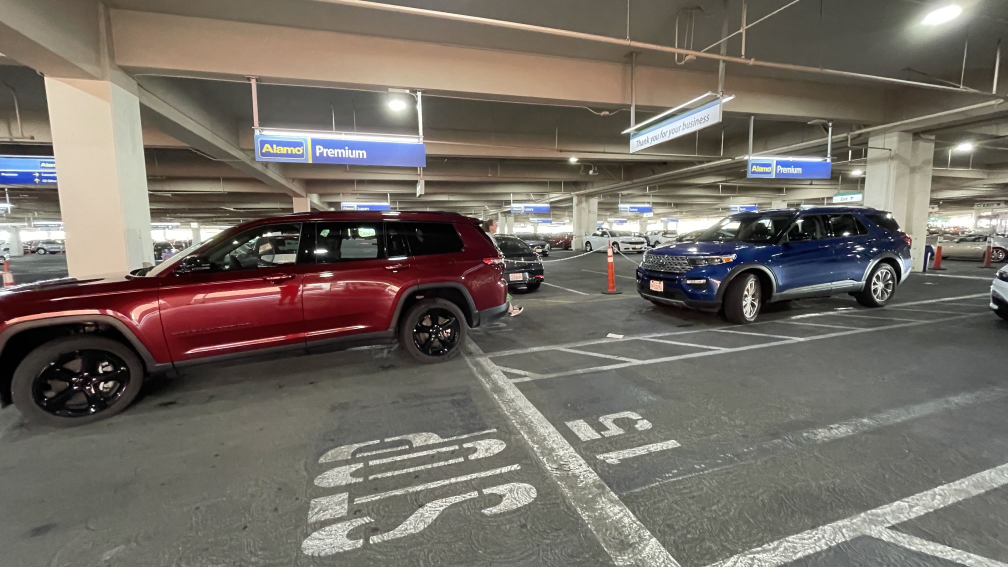 In de garage van Alamo aankomend schrok ik wel even (15:30 uur); er stonden misschien 20 à 30 auto's in de totale garage (midsize, standard en 1 enkele SUV), maar geen enkele Jeep Wrangler. Ik ben meteen naar een Greeter gelopen en heb om hulp gevraagd. Hij bellen en enkele momenten later liepen we naar de naastgelegen parkeerplaatsen van NationalCar. Daar stonden 2 Wranglers opgesteld. "The white one is yours Sir, keys are in the car". Tot mijn verbazing zag ik dat de andere Wrangler een Rubicon was en ik vroeg de Greeter; "Can I also have the red one? No problem Sir, let me get the keys".