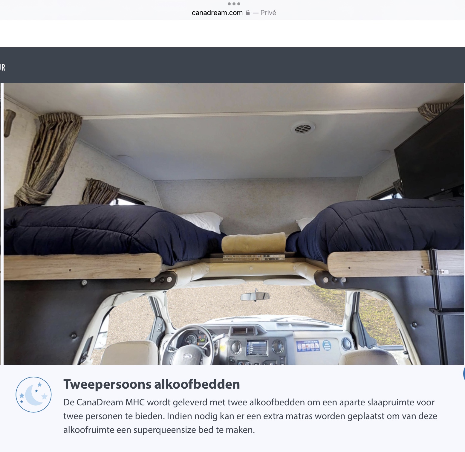 Na twee eerdere reizen met een camper in de USA zijn we nu voor zomer '25 aan het kijken naar het huren van een camper vanuit Calgary (met nog wel een uitstapje naar de USA, namelijk Glacier NP). Naast het zusje van Cruise America zien we veel campers van Cruise Canada, maar ook van CanaDream. Het valt me op dat de layout van deze campers (model MHC, MHB en MHA) anders is dan bij de campers die we in de USA hebben gehad (en dan met name de bedden in de cap over). De bedden lijken niet in de breedte van de camper te liggen, maar in de lengte en dan deels met een gat / ruimte tussen de bedden. Nu lees ik op de site van CanaDream alleen bij de MHC dat dit gat kan worden opgevuld met een extra matras (niet bij de andere modellen). Iemand hier ervaring mee?