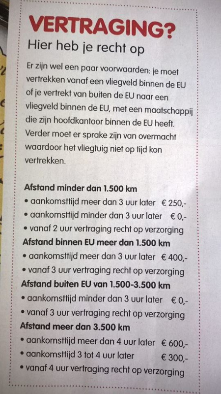 http://verkeersbureaus.info/nieuws/2016 ... tschappij/Een onaangekondigde, zogenoemde ‘wilde’ staking van eigen personeel levert in de ogen van de Nederlandse rechter wel overmacht op; de desbetreffende luchtvaartmaatschappij hoeft dan geen compensatie te betalen. Hetzelfde is van toepassing op beide soorten staking door niet-eigen personeel (bijvoorbeeld luchtverkeersleiding of bagage-afhandelaars).