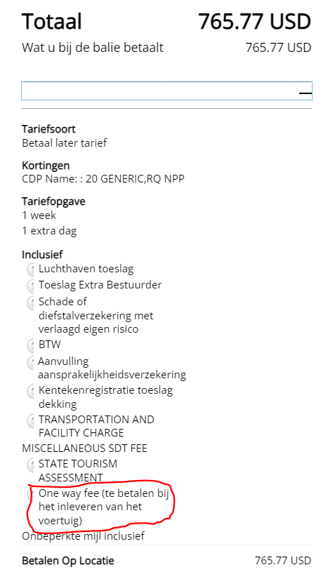 Zoek een auto voor one way 1 week San fran-Las vegas. Ik krijg bij hertz.de of .be de beste prijs maar het is me onduidelijk of de one way fee al inclusief de prijs van 765,77USD is? Zie hieronder