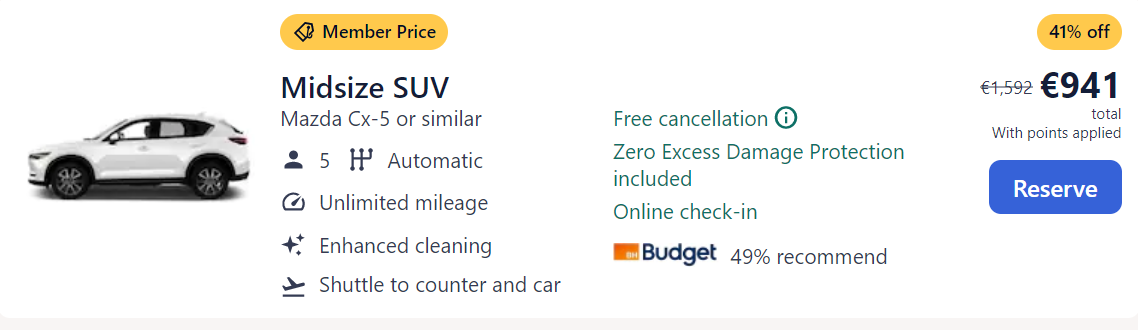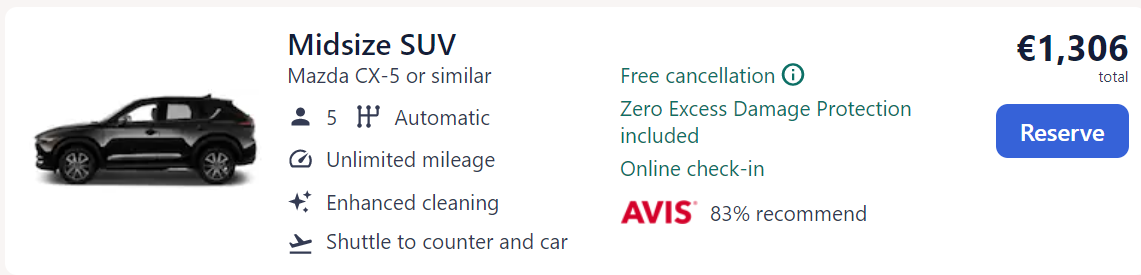 Ik heb verder ook een BMW X3 of soortgelijk staan bij Sixt voor 1740 dollar euro en via Kayak ook een auto voor 1730 euro gereserveerd via bsp-auto.com, dit betreft een intermediate SUV een verhuurder is Europcar/FOX.