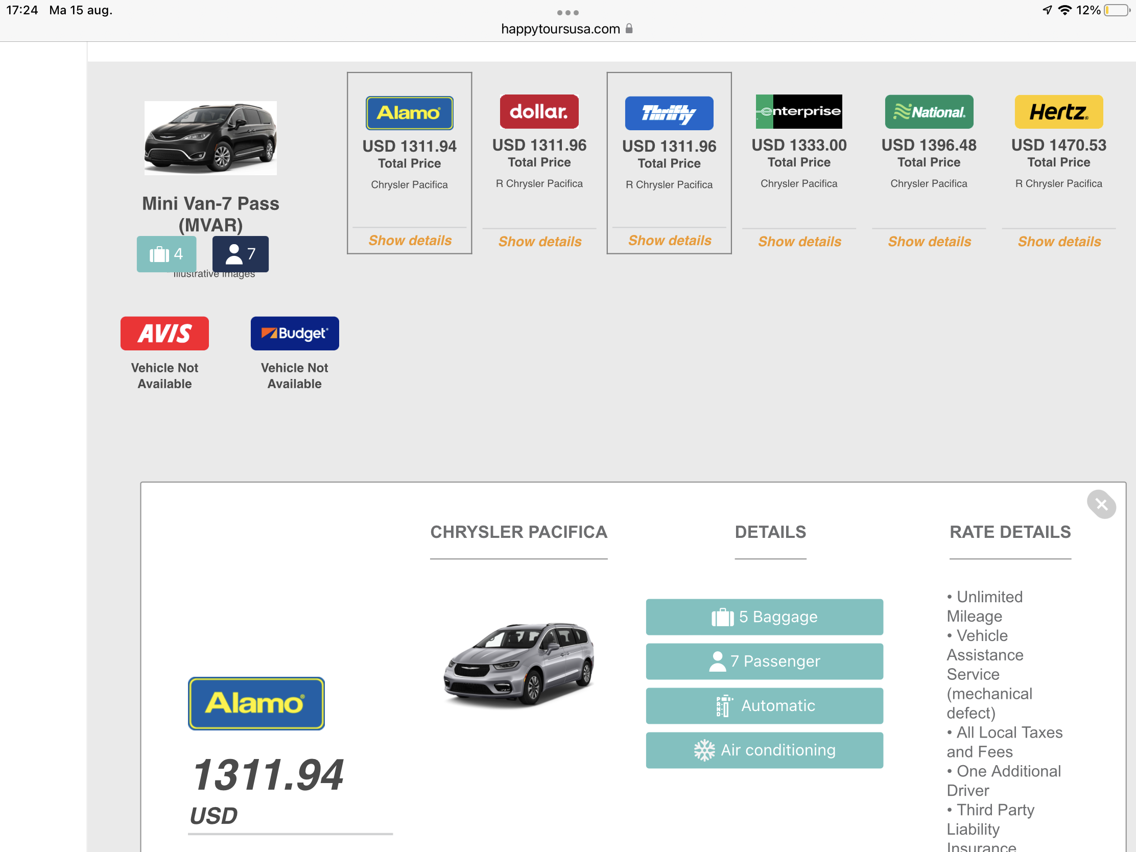 Is er iemand die misschien even mee kan kijken naar prijzen voor een huurauto in Orlando van 4 januari 19:00 tot 18 januari 15:00? Momenteel kom ik uit bij happytours op $1311 voor een minivan. (We reizen met 5 personen, 5 handbagage koffers en 3/4 grote koffers.) Ik heb nu geen upgraded account bij een verhuurder dus kan die prijzen nu niet checken. Maar dan zou ik weten of het de moeite is om een upgrade te regelen. Alvast heel erg bedankt.