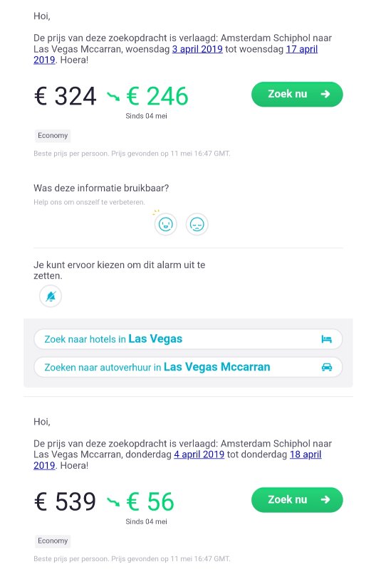 Ik krijg een Prijsalarm van Skyscanner voor April 2019.