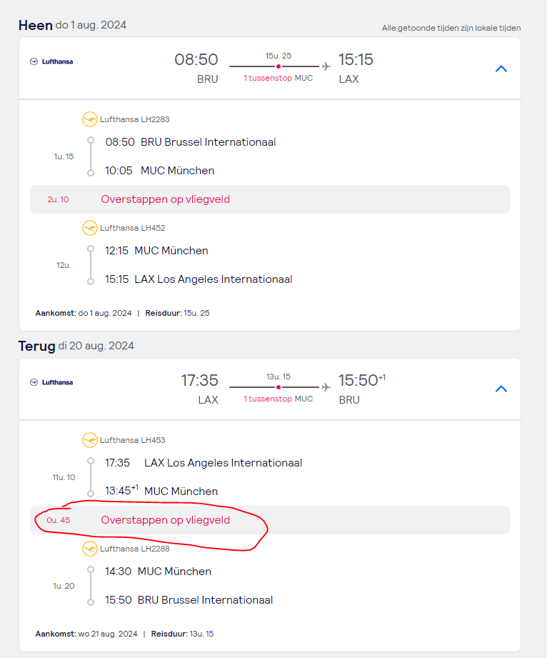 Zelf heb ik geen ervaringen met overstappen. Onderstaande vlucht is terug te vinden op de website van Lufthansa en beide vluchten zijn met hun, voor de terugreis is er maar 45 min overstap tijd. Lijkt dit niet heel krap te zijn? Aan de andere kant als ze het zelf voorstellen, moet het toch haalbaar zijn, niet?