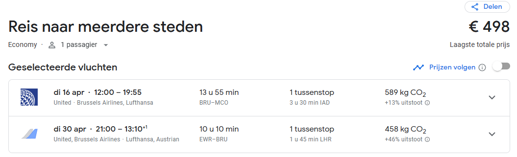 Zo kom ik aan een prijs van €900 met een overstaptijd van 2uur. Ter vergelijking, andere tickets voor dezelfde reis/aankomsttijden hebben we voor €1250. Kijken we voor dezelfde prijscategorie dan zijn we 2,5uur langer onderweg door de overstaptijden.