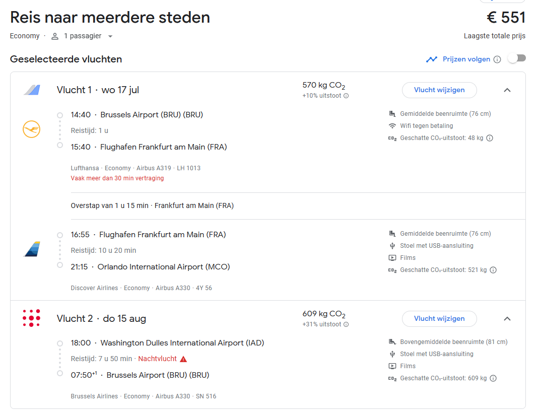 Dan hebben we een overstap in Washington van 4,5 uur voor €900. Betere vluchttijden vind ik voor €1250. Voorlopig is de beste verbinding retour NY met een aparte vlucht om in MCO te geraken, is wel wat gedoe maar scheelt meer dan €1000 op totale prijs. Maar zoals aangegeven, als er vertraging is ben je wel choco…