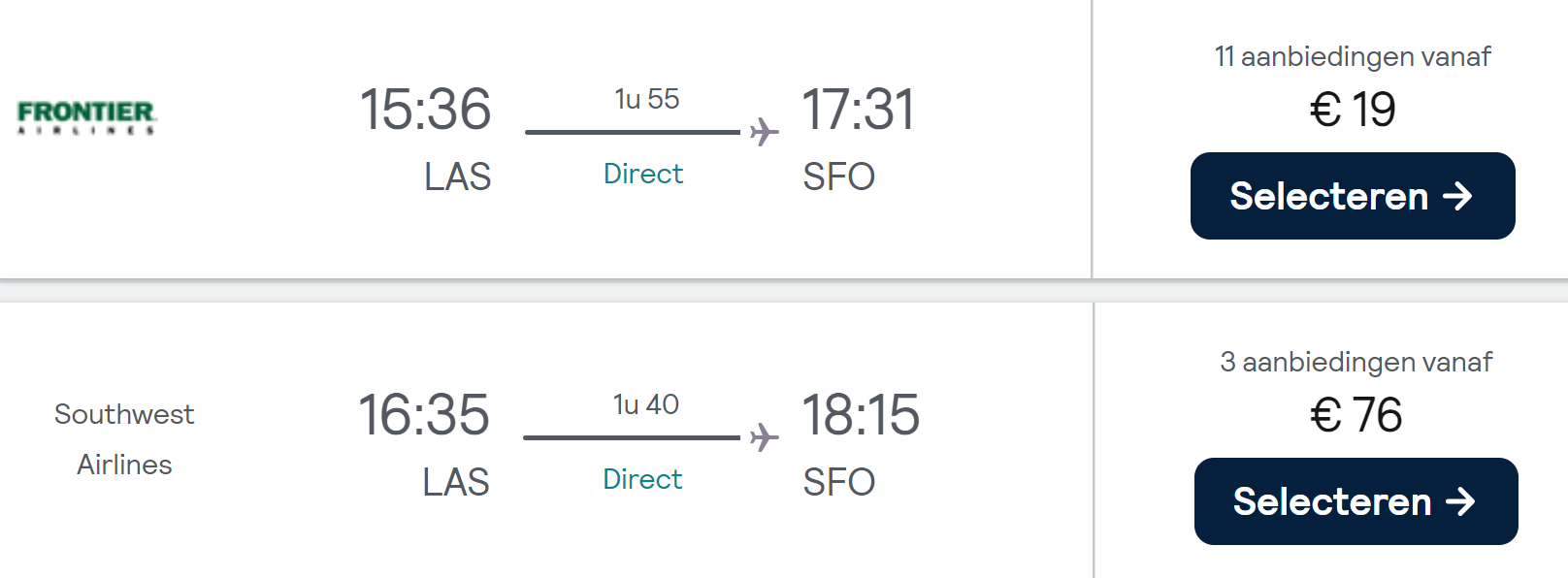 Via Skyscanner vind ik ook veel goedkope enkeltjes LAS-SFO. Vanaf $19 (Frontier). Is dat te duur?
