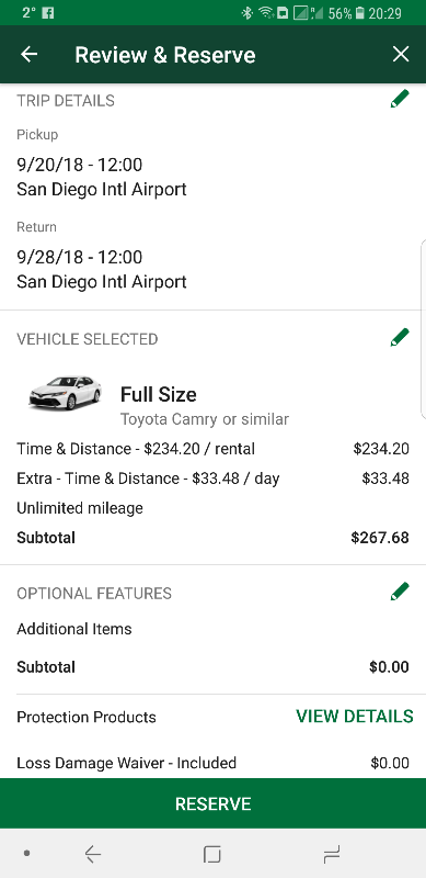 Ter referentie, bij Hertz huur je midsize (dus aisle access) voor $270 in San Diego voor deze periode. Iets duurder dan National met die BJ's coupon.
