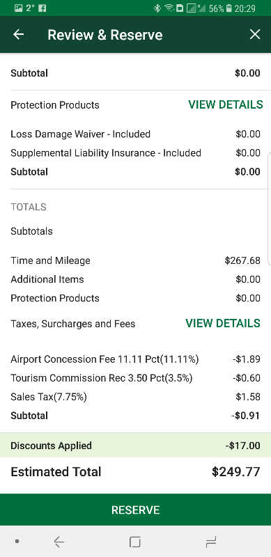 $249 = EUR 203. Daarmee rij je, met Executive Aisle toegang, met minimaal een standard SUV of een premium sedan weg. Er is geen enkele verplichting, kom je niet dan vervalt de reservering kostenloos.
