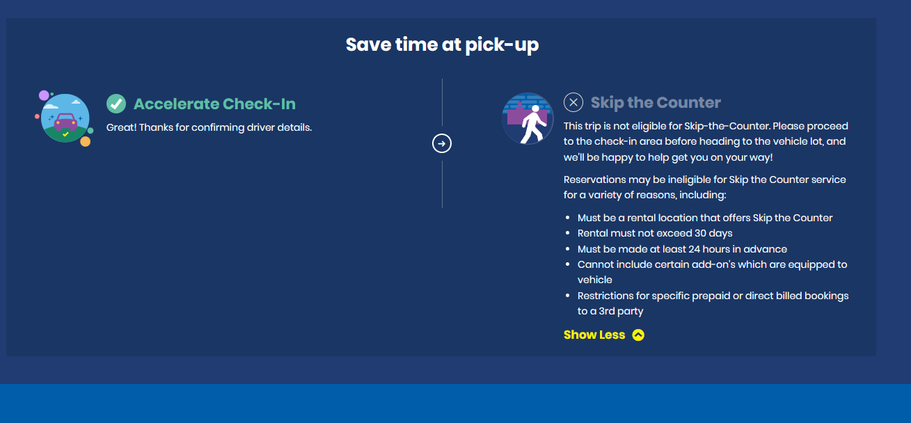Nu mijn volgende vraag. Ik heb het eens bekeken, maar het ziet er naar uit dat ik niet Skip the Counter kan doen, zoals blijkt uit bijgevoegde schermafdruk. Van de redenen die gegeven worden, is er niet een van toepassing, tenzij het bij DFW inderdaad niet mogelijk is. Heeft iemand daar ervaring mee? En zijn er misschien anderen bij wie dat ook zo aangegeven wordt? Vraag me af of dat nog gaat veranderen?