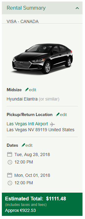 Net geboekt via de National app, met de Canada code-truc: 34 dagen midsize SUV, Las Vegas van 28 augustus tot 1 oktober voor $1232 ofwel €1026. Niet gek!