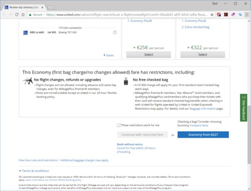En dan voordat je verder moet gaan moet je het vakje "These restrictions work for me" aanvinken. De "logische" blauwe knop die je al wel mag indrukken gaat verder met het normale, iets duurdere tarief, inclusief bagage.This economy (first bag charge/no changes allowed) fare has restrictions, including: