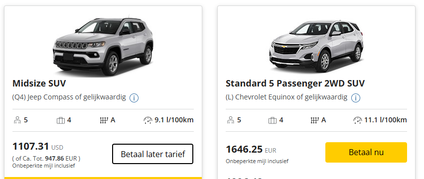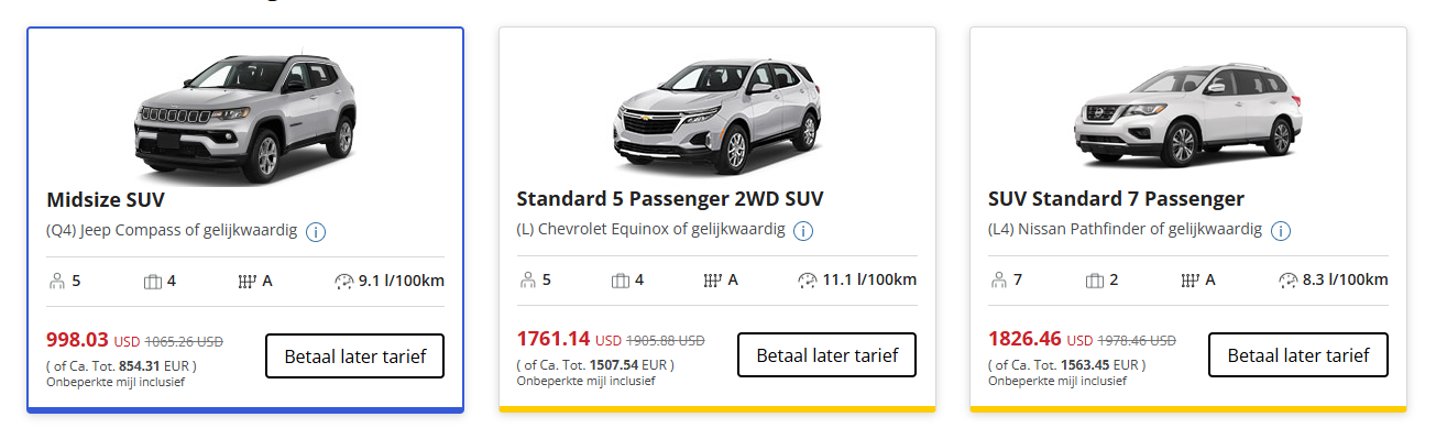 Op de site van Hertz vind ik voor 17 dagen volgende zomer onderstaande 2 SUV's.
