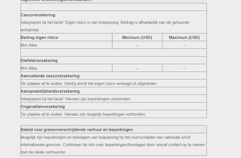 Volgens mij zit alles er gewoon bij hoor. Het maakt niet uit waar je huurt. 2 dingen zijn altijd hetzelfde. De schadeverzekering en de aanvullende aansprakelijkheid tot 1 miljoen dollar.