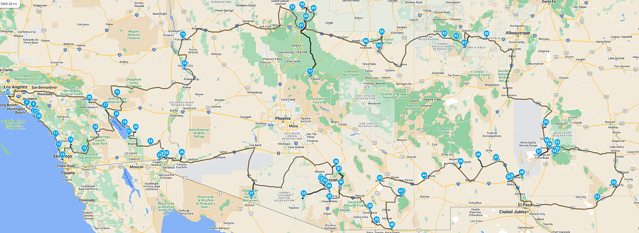 Soms ontkom je niet aan langere afstanden, maar als je vroeg op pad bent is het wel te doen. Wij gaan ook een stuk die kant op deze zomer. Ook vanuit LA naar San Diego, alleen wij gaan dan naar Palm Springs (aerial tram) via Oatman naar Kingman, Grand Canyon, sedona, Tucson, Tombstone, Bisbee, las Cruses, Alamogordo (white Sands), Carlsbad caverns, Roswell, Albuquerque, via Madrid naar Santa Fe, Farmington, Page (Antelope canyon), Zion, Las Vegas terug naar LA.