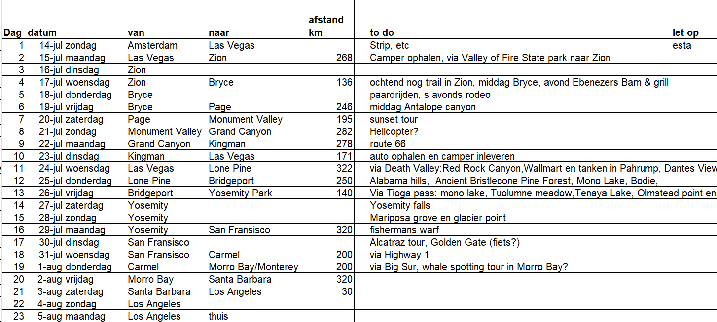 (camperhuur is nog prima te regelen, overnachtingen in de parken ben ik uiteraard te laat voor, maar heb voor Zion, Bryce en Yosemity nog campings/hotels kunnen vinden, die ik nu ook wil gaan boeken). We leggen verder nog niet alles 100% vast qua overnachtingen of met annuleringsoptie om nog iets te kunnen bewegen ter plekke als dat beter uitkomt.